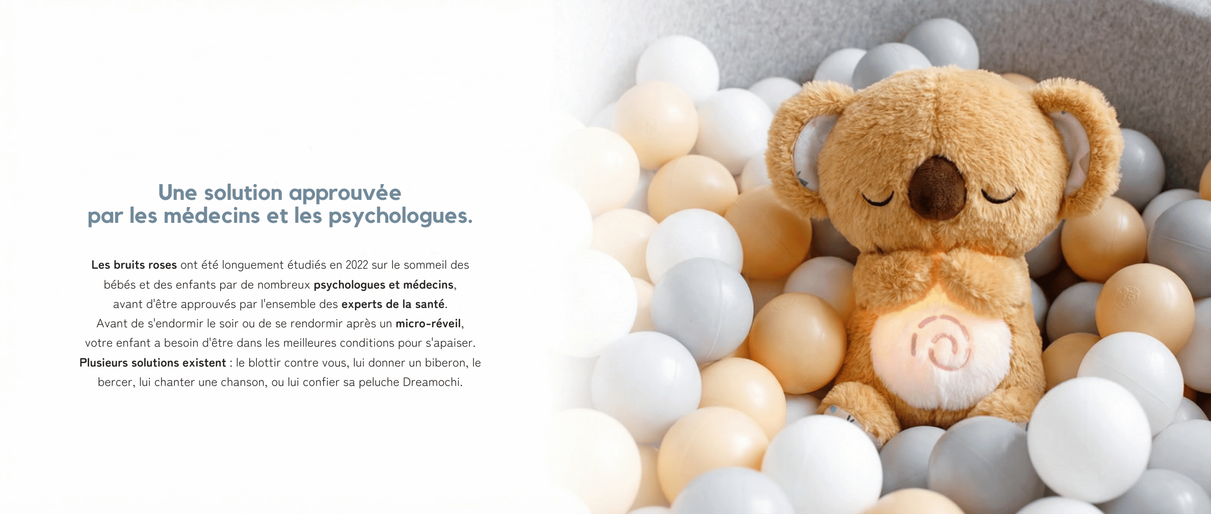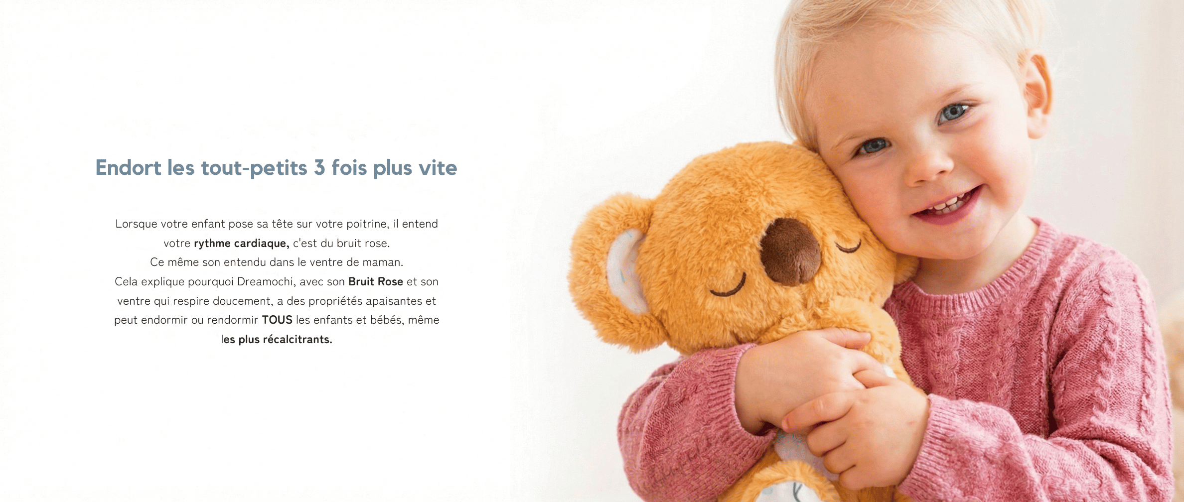 Cela explique pourquoi Dreamochi, avec son Bruit Rose et son ventre qui respire doucement, a des propriétés apaisantes et peut endormir ou rendormir TOUS les enfants et bébés, même les plus récalcitrants.